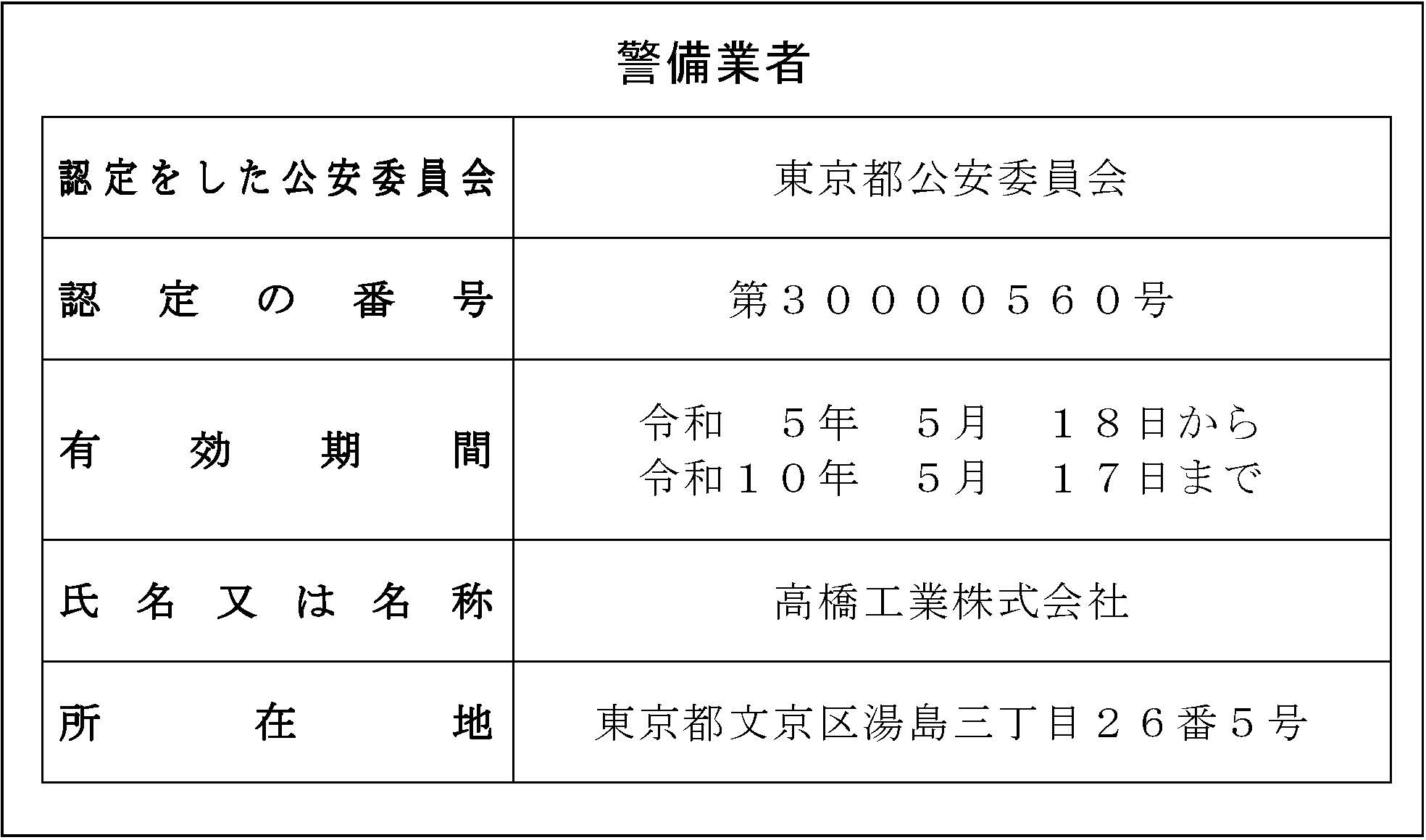 | 警備業法 | 東京都公安委員会 第30000560号 | ||||||||||||||||