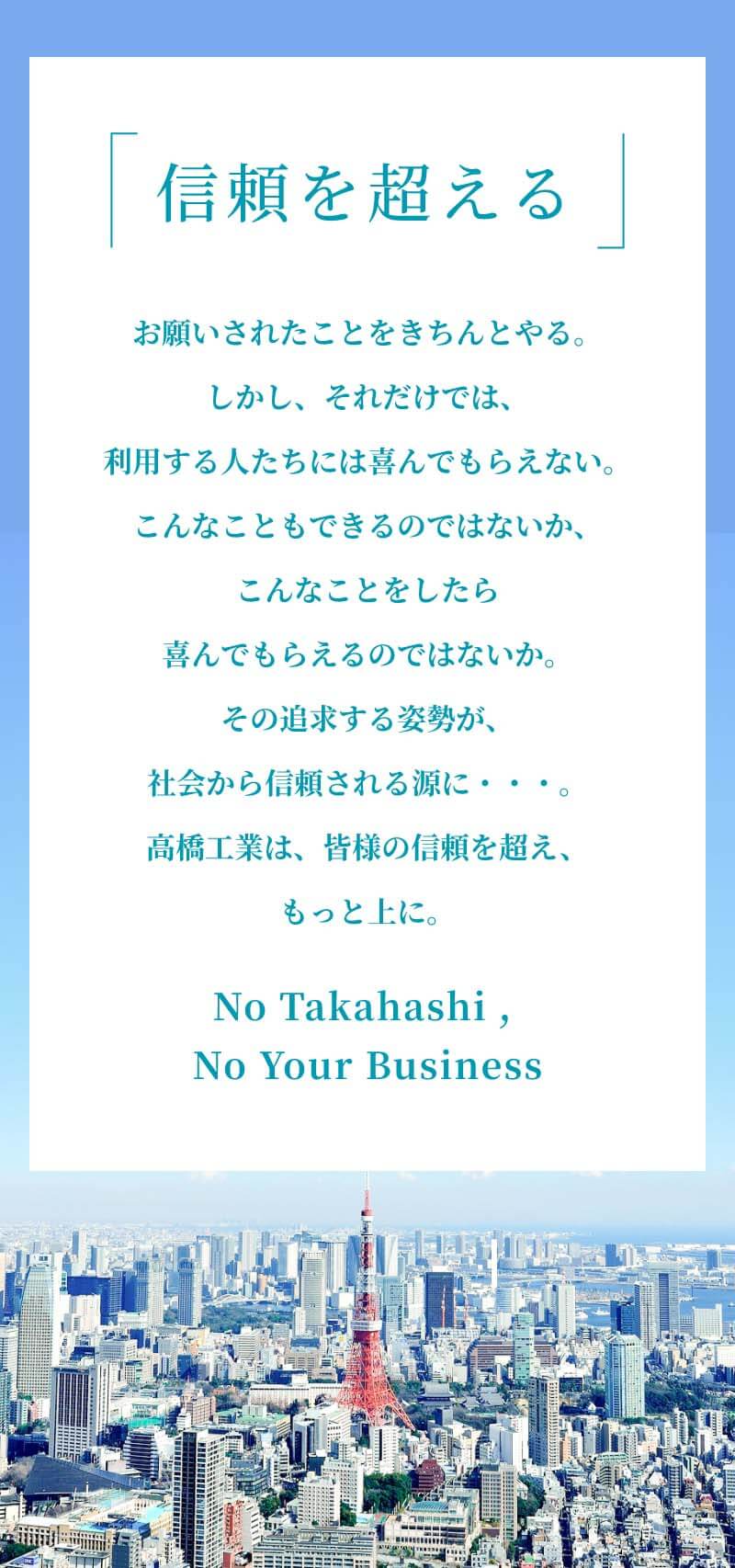 お願いされたことをきちんとやる。 しかし、それだけでは、 利用する人たちには喜んでもらえない。 こんなこともできるのではないか、 こんなことをしたら 喜んでもらえるのではないか。 その追求する姿勢が、 社会から信頼される源に・・・。 高橋工業は、皆様の信頼を超え、 もっと上に。